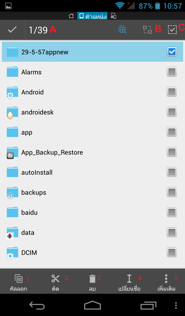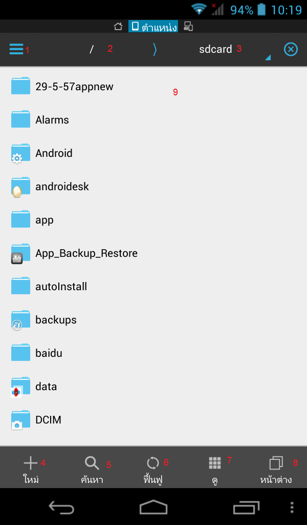 3.ตำแหน่งที่เราอยู่ตอนนี้ ไฟล์หรือโฟลเด้อที่โชว์ด้านล่าง อยู่ใน sdcard เป็นต้น